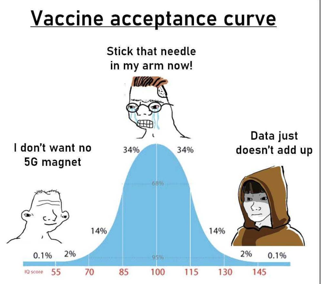 A theory has circulated that high IQ (smart) people conformed to the Covid superstition more than low IQ (not smart) people. There is a subset of the the theory, illustrated below, that the not intelligent and really intelligent did not conform while the middle of the Bell curve, known derogatorily as mid-wits, completely conformed as they are seemingly wired to do: